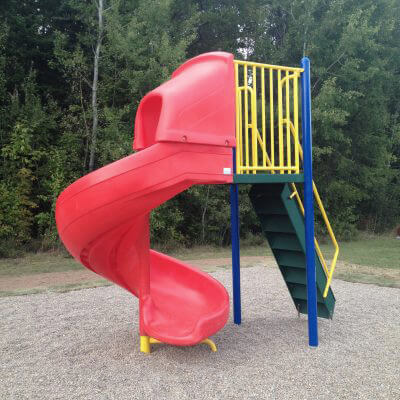 Red and blue slide and bench in a park, on Postech galvanised smile
