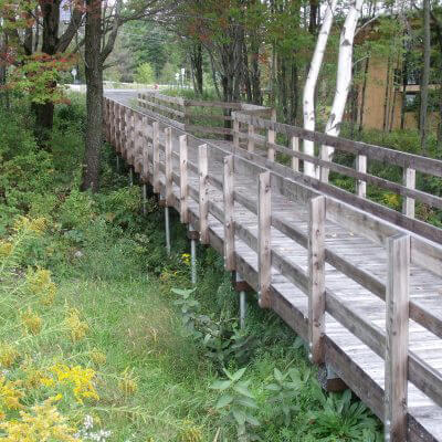 Wooden footbridge with security fences, on Postech thermal screw piles