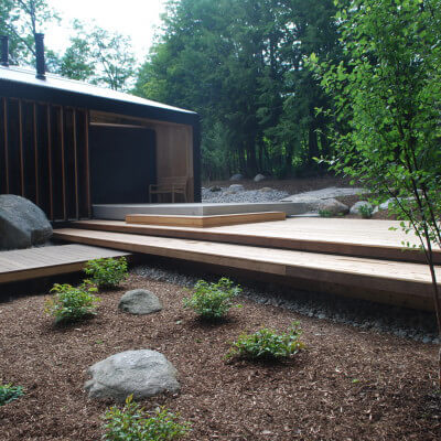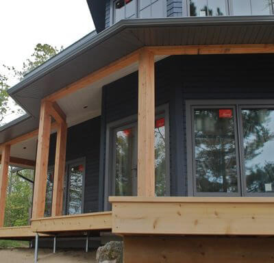 Terrasse en bois d’une petite maison en nature – Postech Muskoka