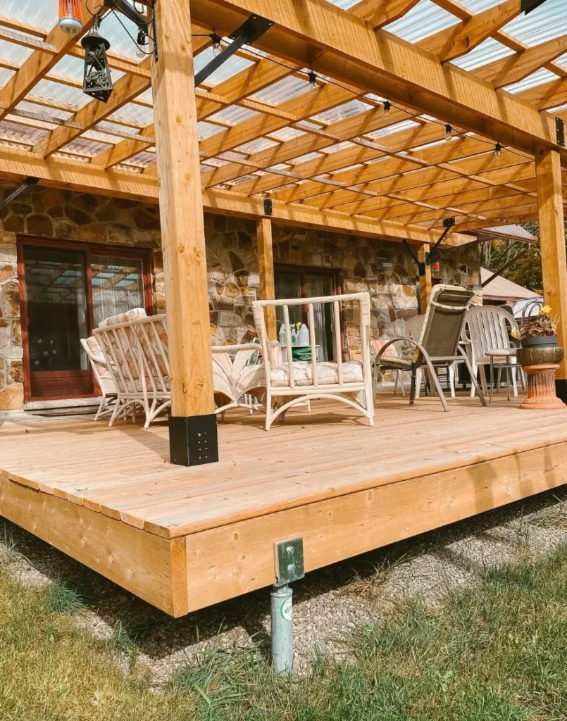Les pieux vissés Vistech ont permis de réduire les coûts de construction, ainsi que la durée de la construction du patio en bois avec pergola.