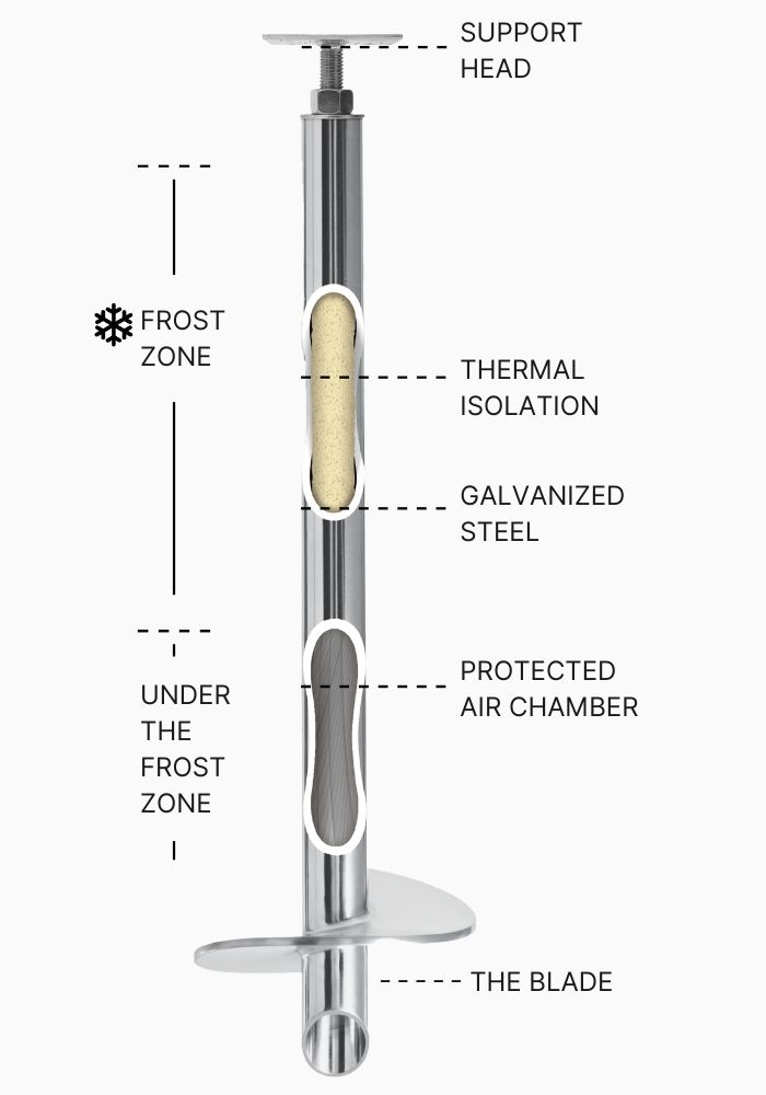 Postech’s screw piles have permanent and durable insulation throughout the entire length of the shaft installed above the frost line. This innovative technology prevents ice or frost from forming at the base of the shaft, providing maximum protection against movement caused by freezing and thawing.